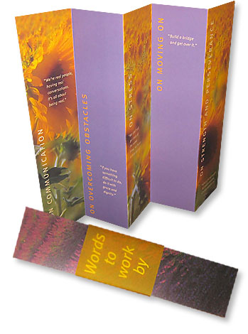 Given to employees in memory of a VP of Human Resources who passed away. The small printed memorial was folded so it could stand on a desk. It contains witty quotes by the VP, who liked to mix her metaphors.
