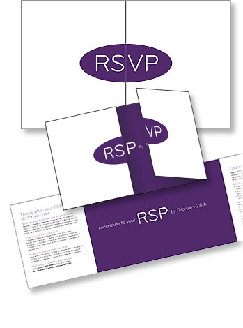 Description: The RSVP turns into an "RRSP" when this self-mailer is opened. Creative direction by StepUp, art direction and design by Ron Kliewer of Reaction Creative.