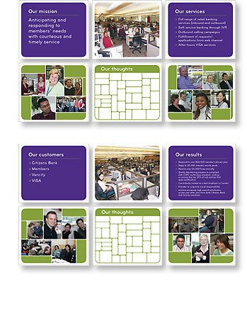 Description: Posters for a call centre lobby. Photos of various employees were used, and there is room for employees to scribble thoughts on the blank, laminated panels with removable pen.